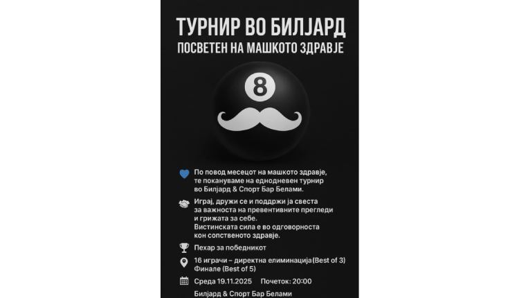 По повод месецот на машкото здравје, те покануваме на еднодневен турнир во Билјард & Спорт Бар Белами. Играј, дружи се и поддржи ја свеста за важноста на превентивните прегледи и грижата за себе. Вистинската